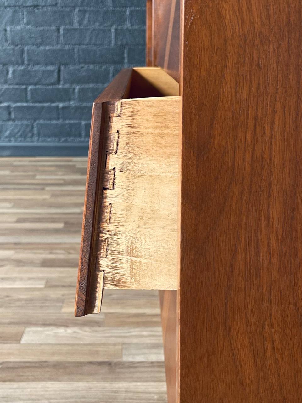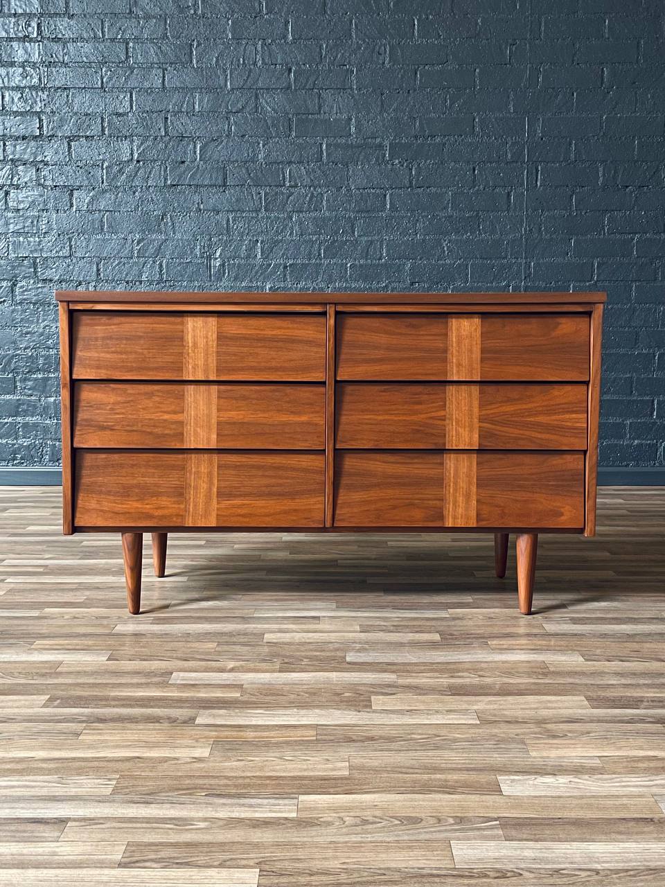 Description: This expertly refinished 6-drawer dresser by Ward Furniture embodies the timeless sophistication of Mid-Century Modern design. Constructed from beautifully grained walnut, it features bold vertical accents and sculpted slatted drawer fronts that create a striking sense of rhythm and symmetry. The drawers glide smoothly and are built with classic dovetail joinery, showcasing the superior craftsmanship of the era. Subtle details like the gently recessed drawer pulls and tapered conical legs speak to a refined, minimalist aesthetic rooted in functionality and form. With its clean lines and warm wood tones, this piece adds a bold yet balanced presence to any bedroom or living space. A masterclass in understated elegance, it reflects the precision and care that defined American furniture-making in the 1960s.