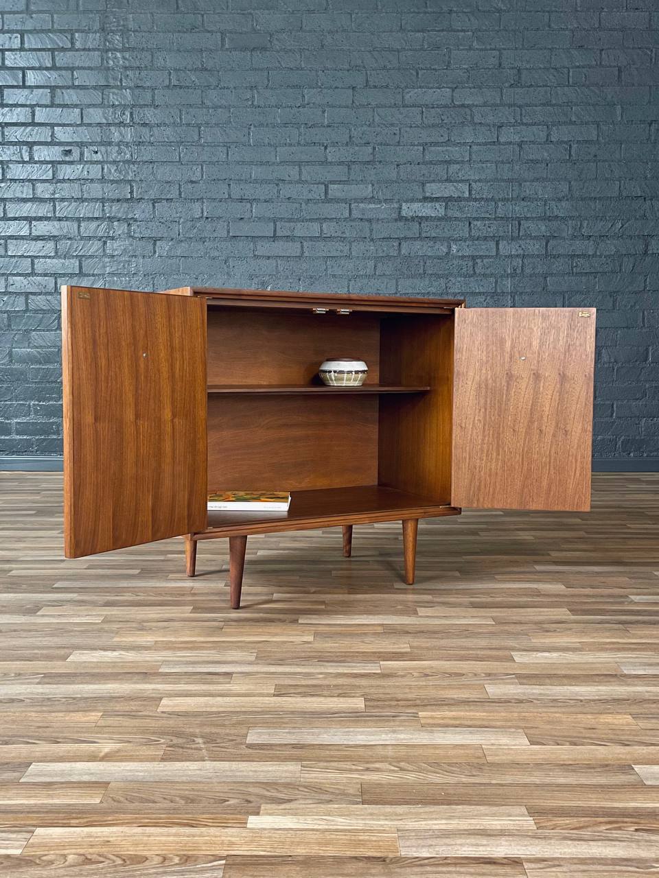 Description: This expertly refinished Mid-Century Modern cabinet by Thomasville Furniture, crafted in the 1960s, showcases a stunning walnut case accented by sculptural rosewood pulls. The clean lines, symmetrical proportions, and subtly tapered legs make it a quintessential piece of American modern design. Inside, a fixed shelf offers functional storage while maintaining the minimalist elegance of the form. The craftsmanship is evident in the precision of the joinery and the warmth of the wood grain throughout.