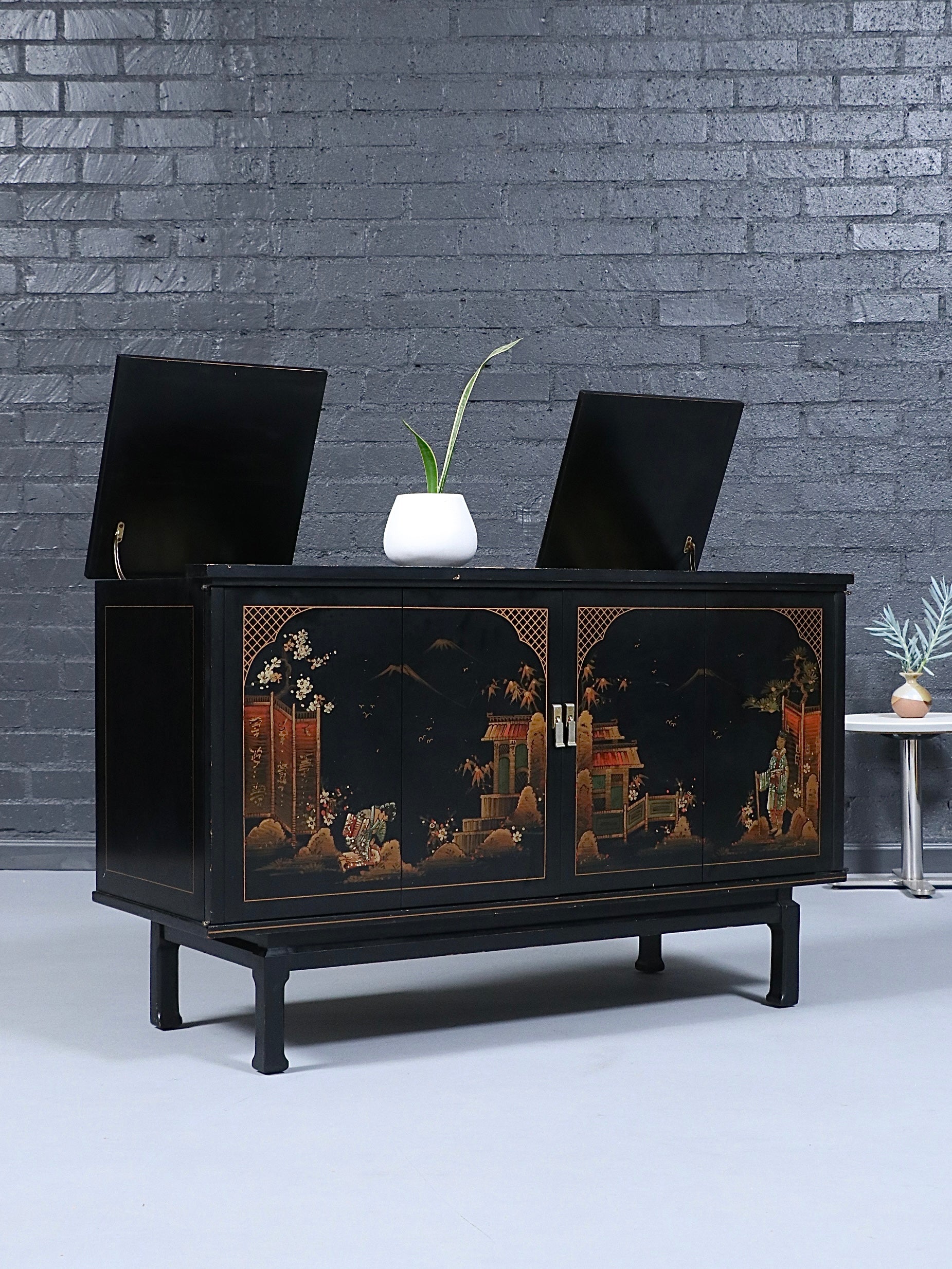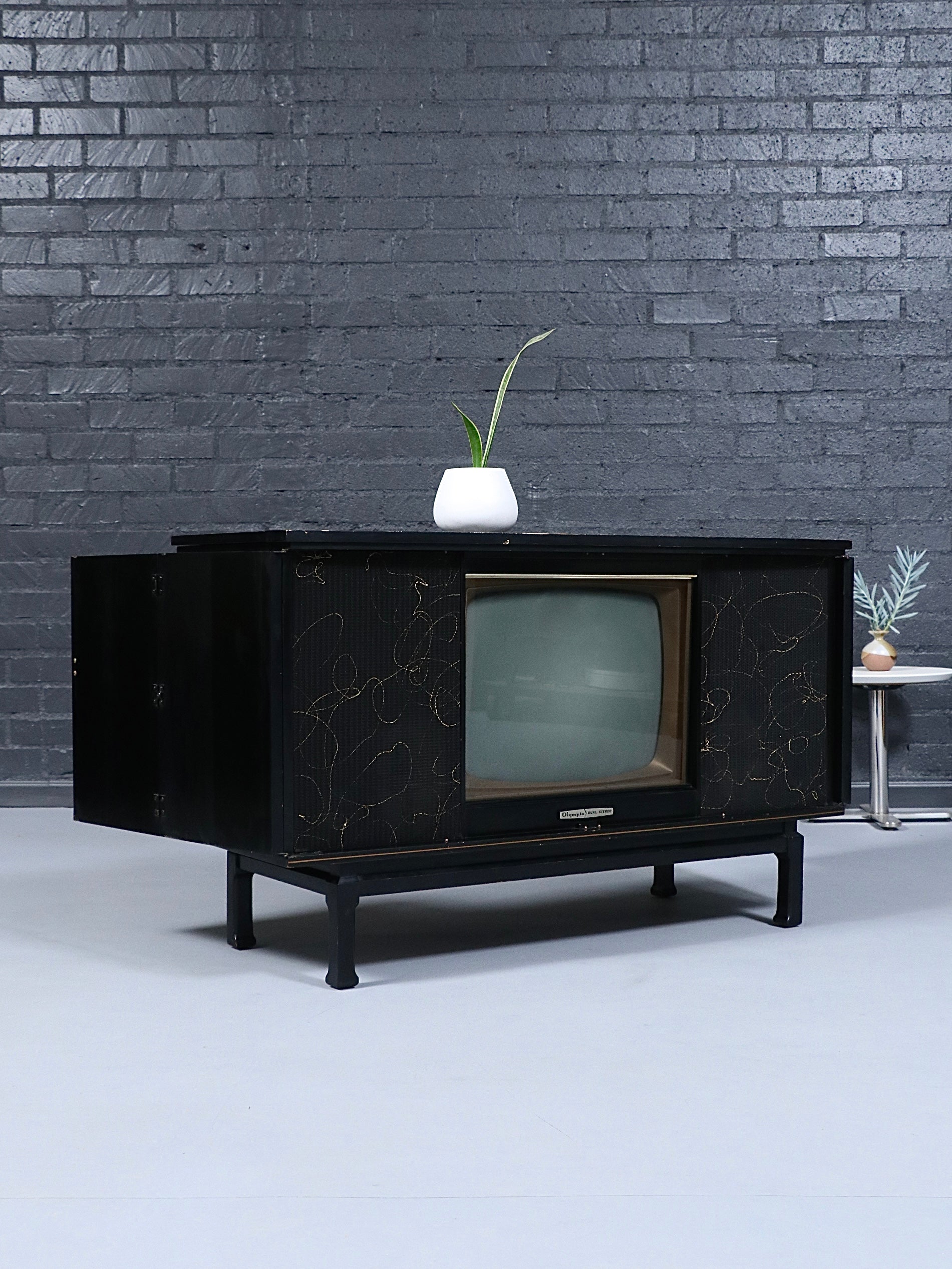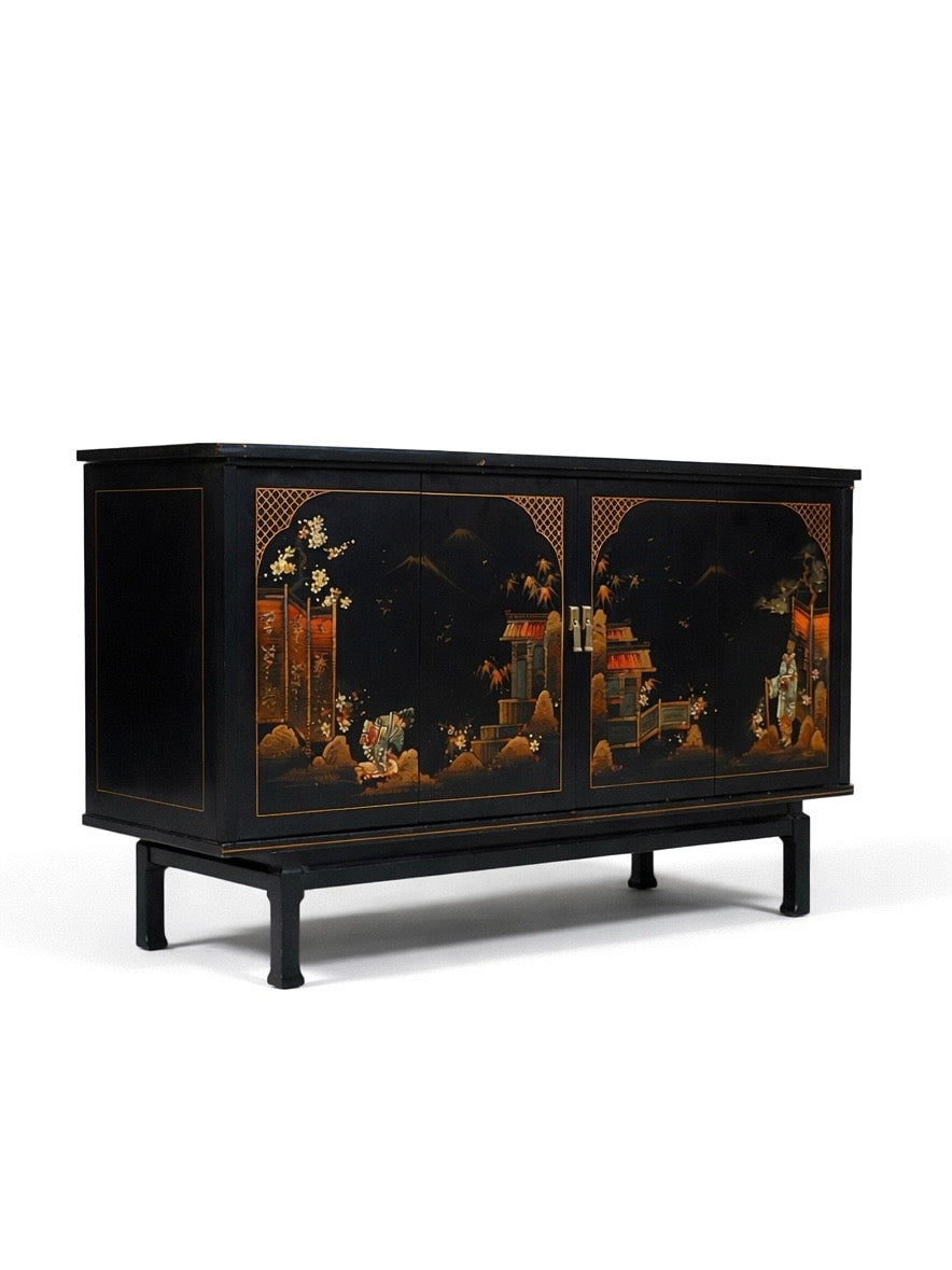 Mid-Century Chinoiserie Black Lacquer TV & Stereo Console with Olympic KC370 Television, c.1960’s
