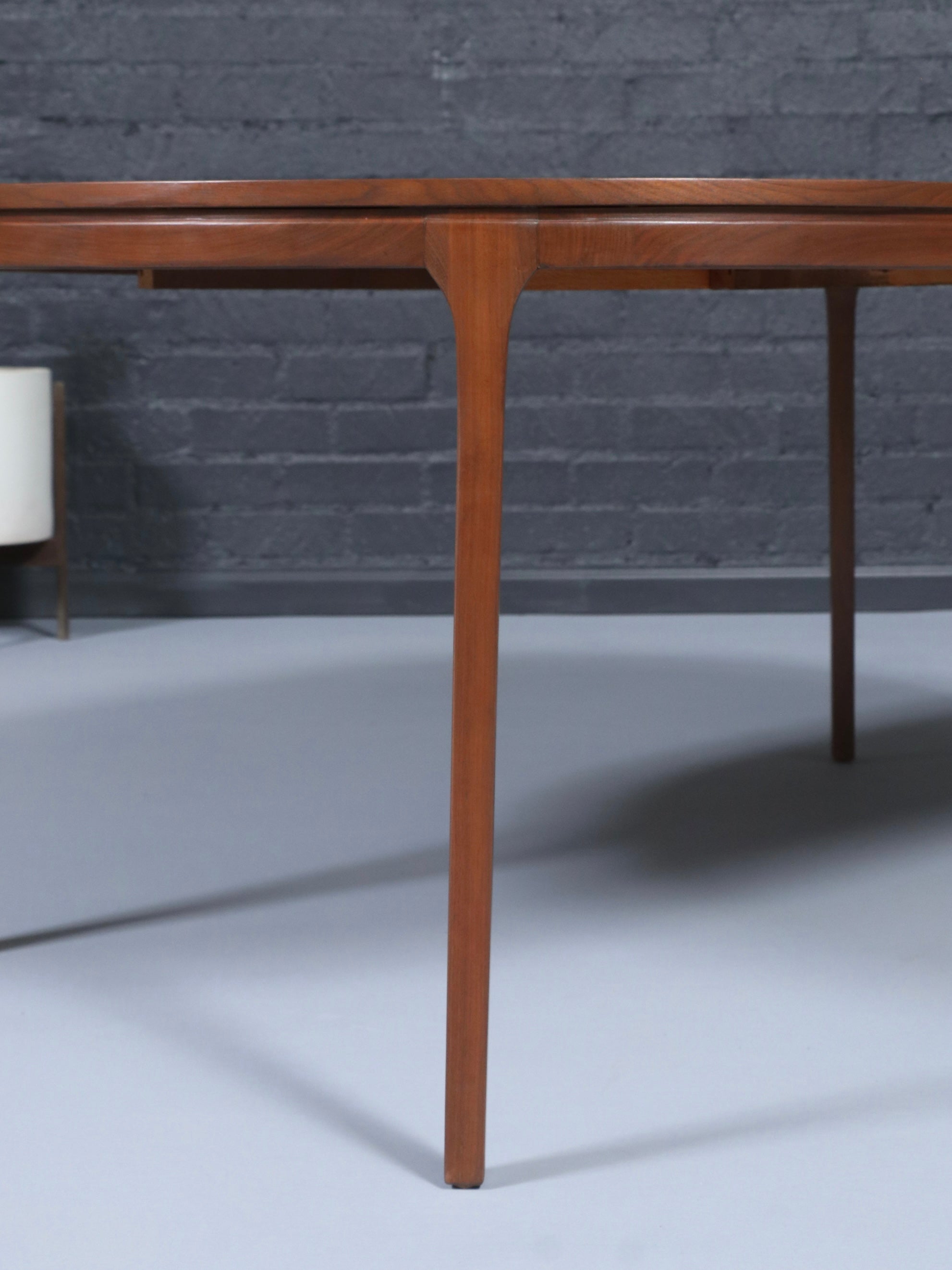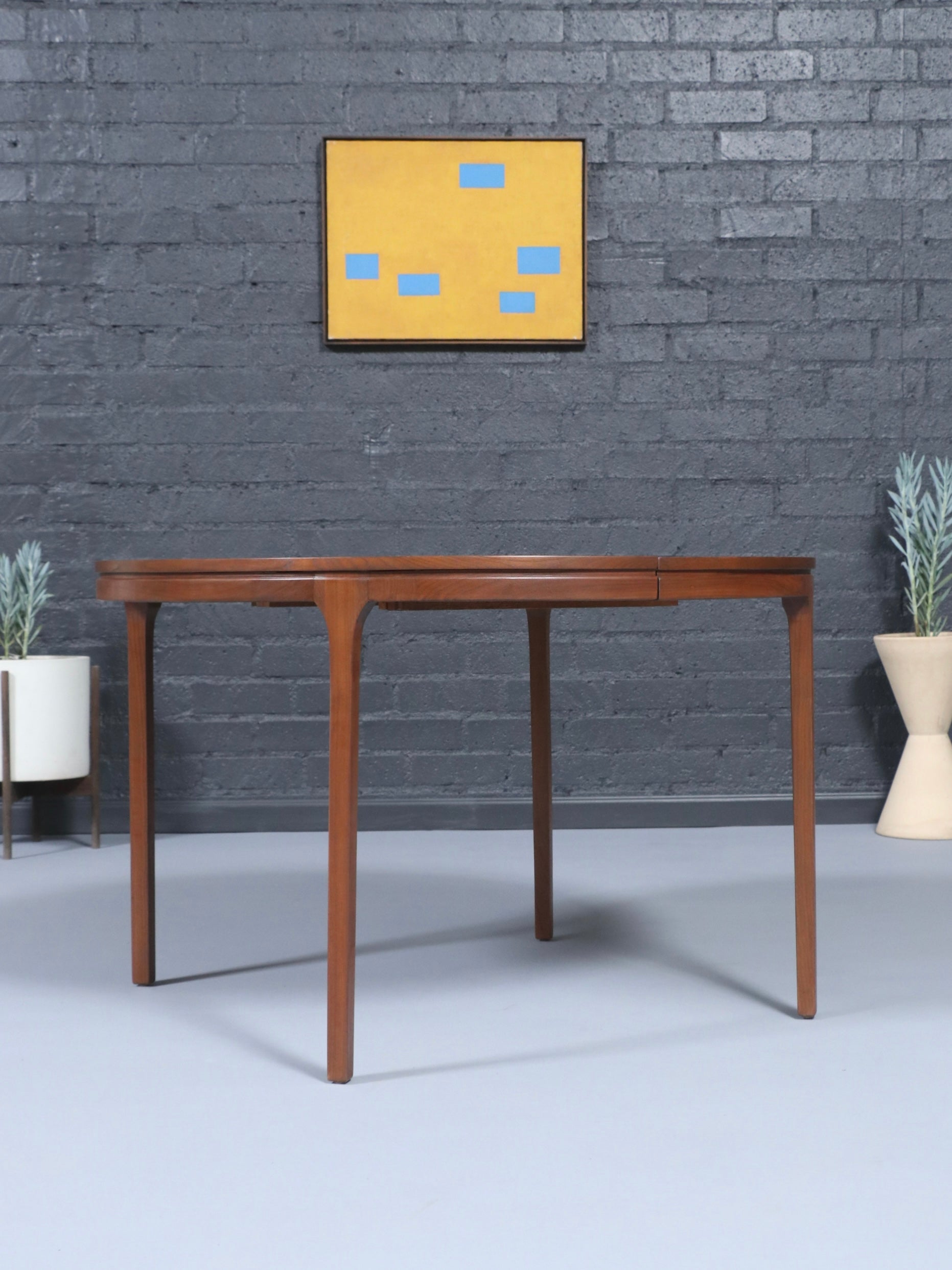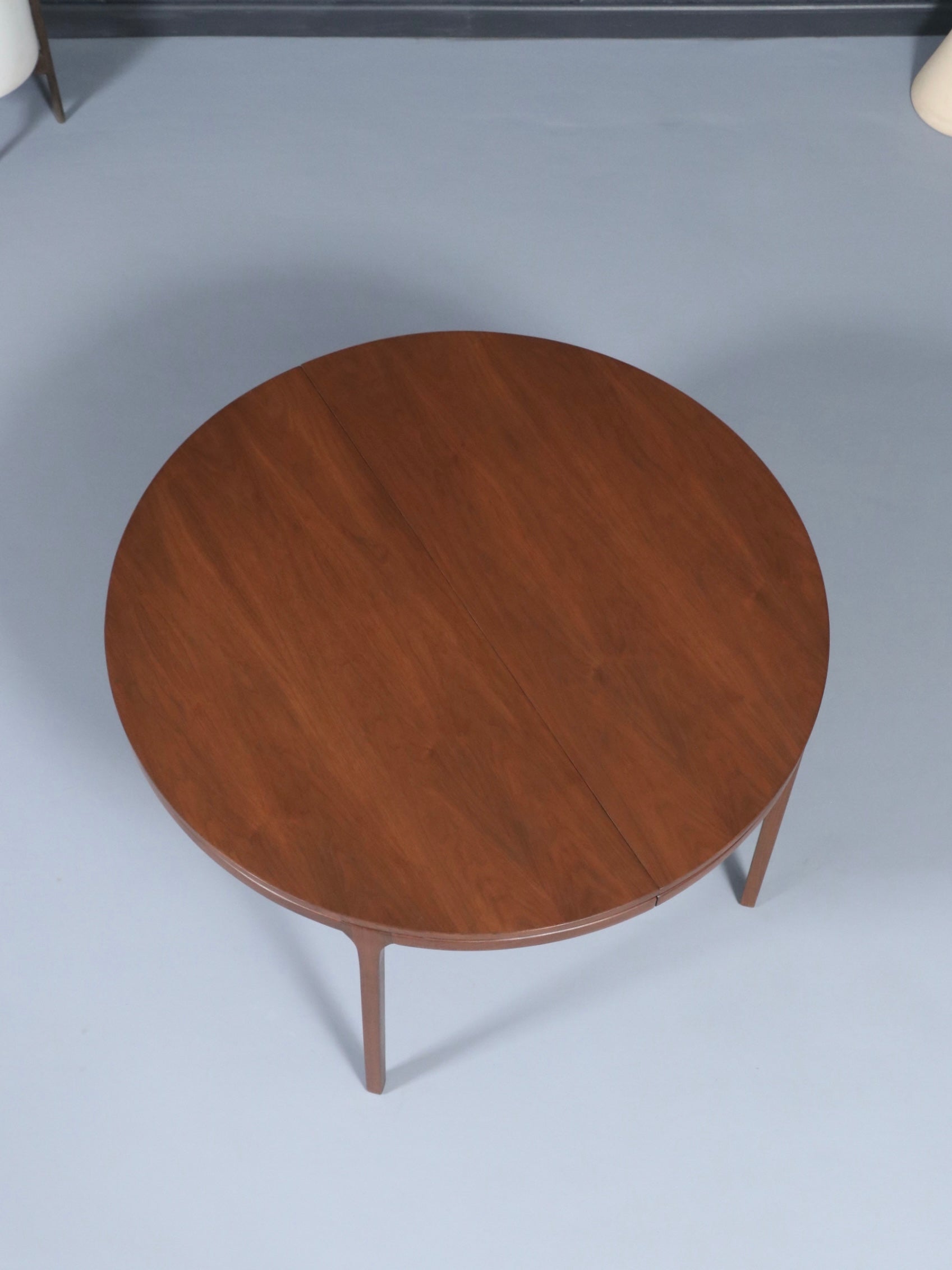 Description: This expanding Mid-Century Modern walnut dining table showcases a beautifully refinished surface that highlights the depth and warmth of the natural grain. Its elegantly tapered legs and softly rounded edges give the piece a light, sculptural presence typical of 1960s American design. The hidden expansion mechanism allows the table to transition effortlessly from a round to an oval form, offering versatility for both intimate settings and larger gatherings. Expertly refinished, the table is smooth to the touch with a rich, consistent tone throughout. A timeless statement piece, it blends craftsmanship and functionality in a way that feels both classic and contemporary.