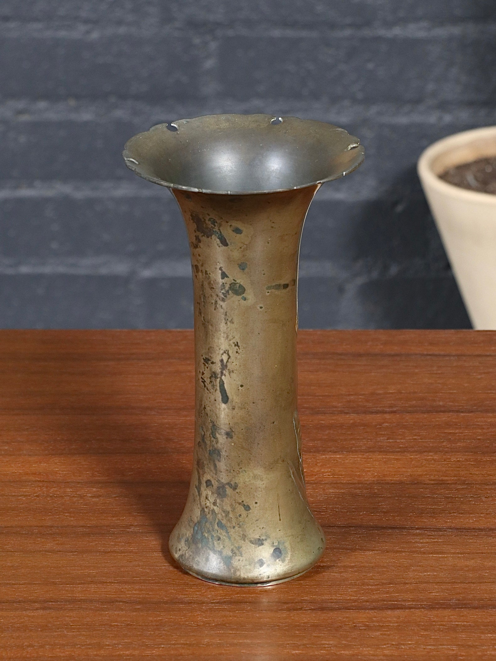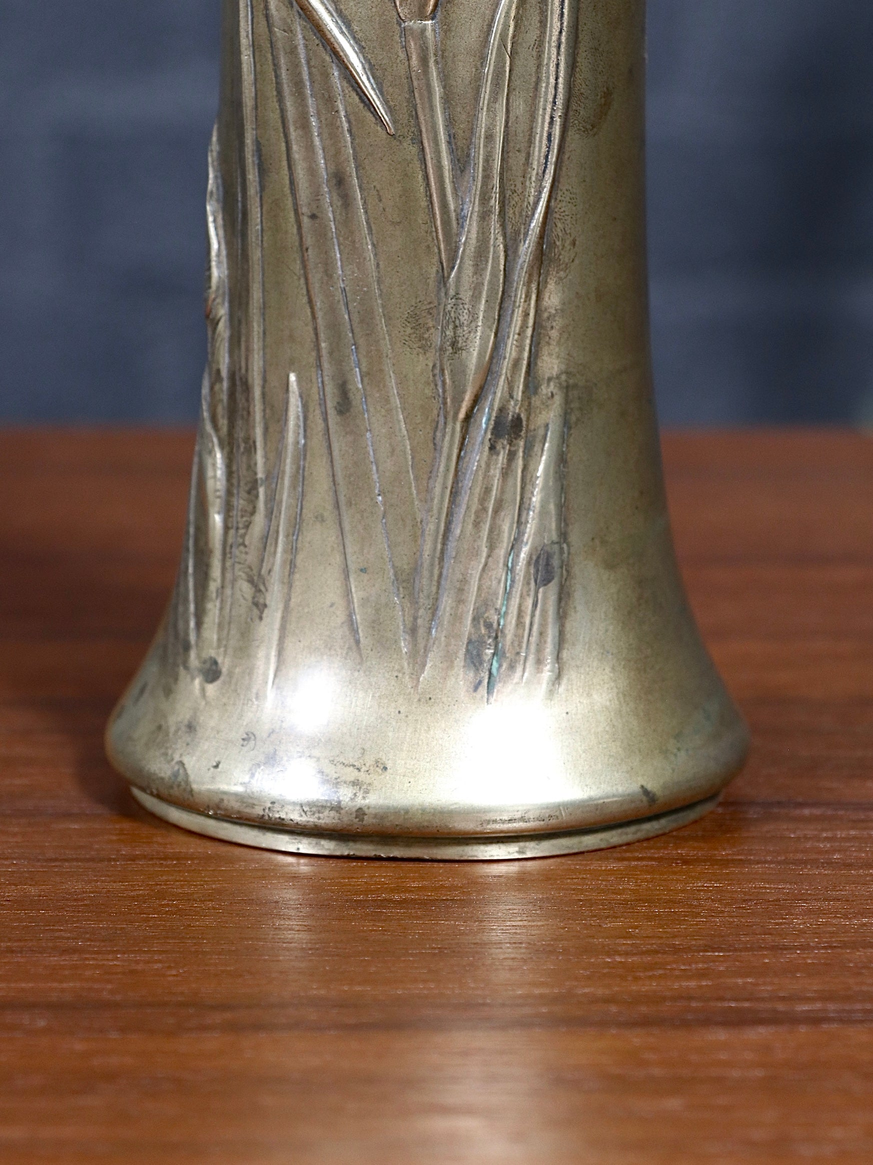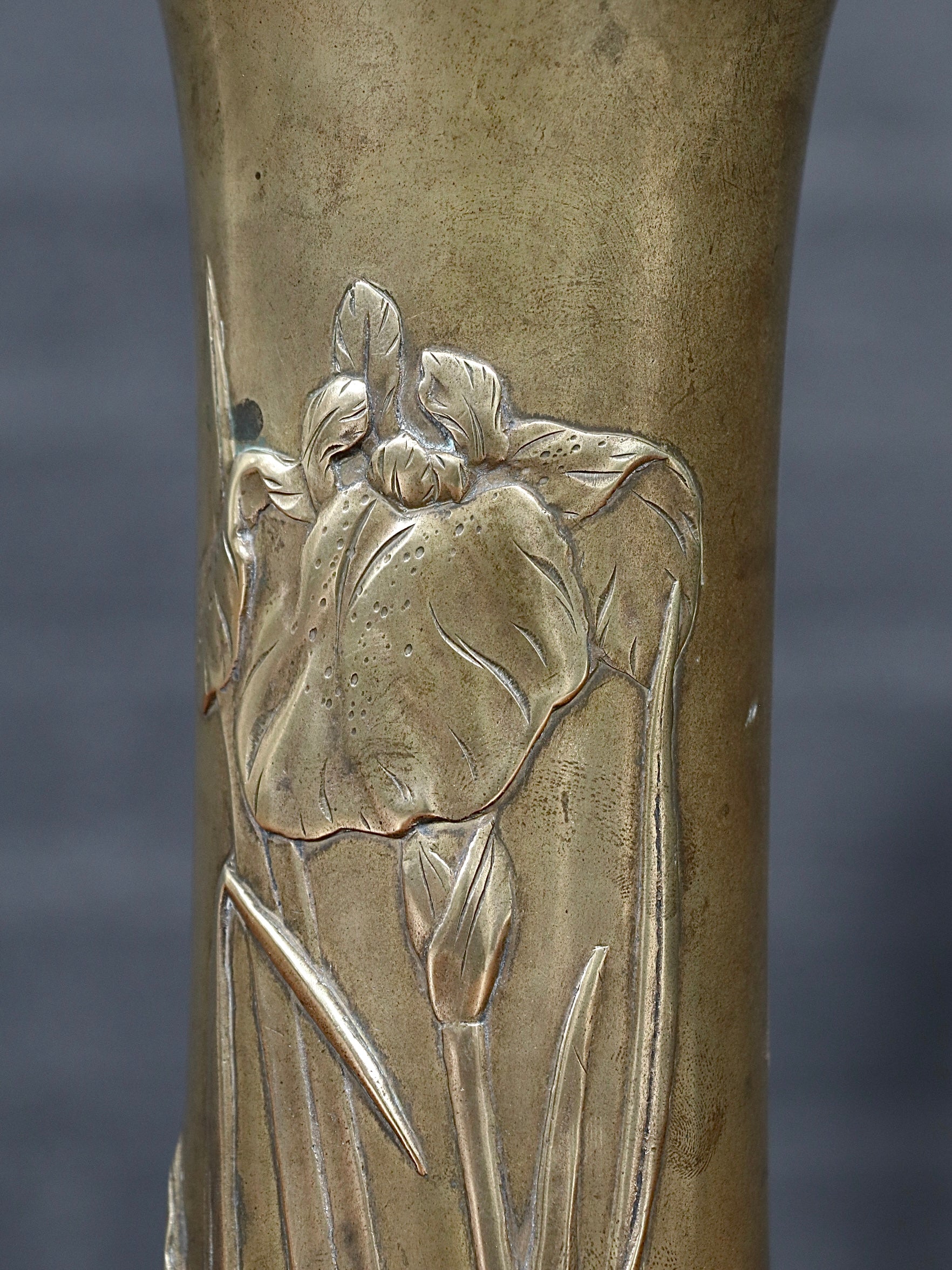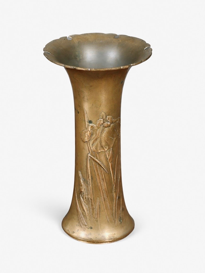 French Art Nouveau Iris Relief Repoussé Brass Vase, c.1920’s