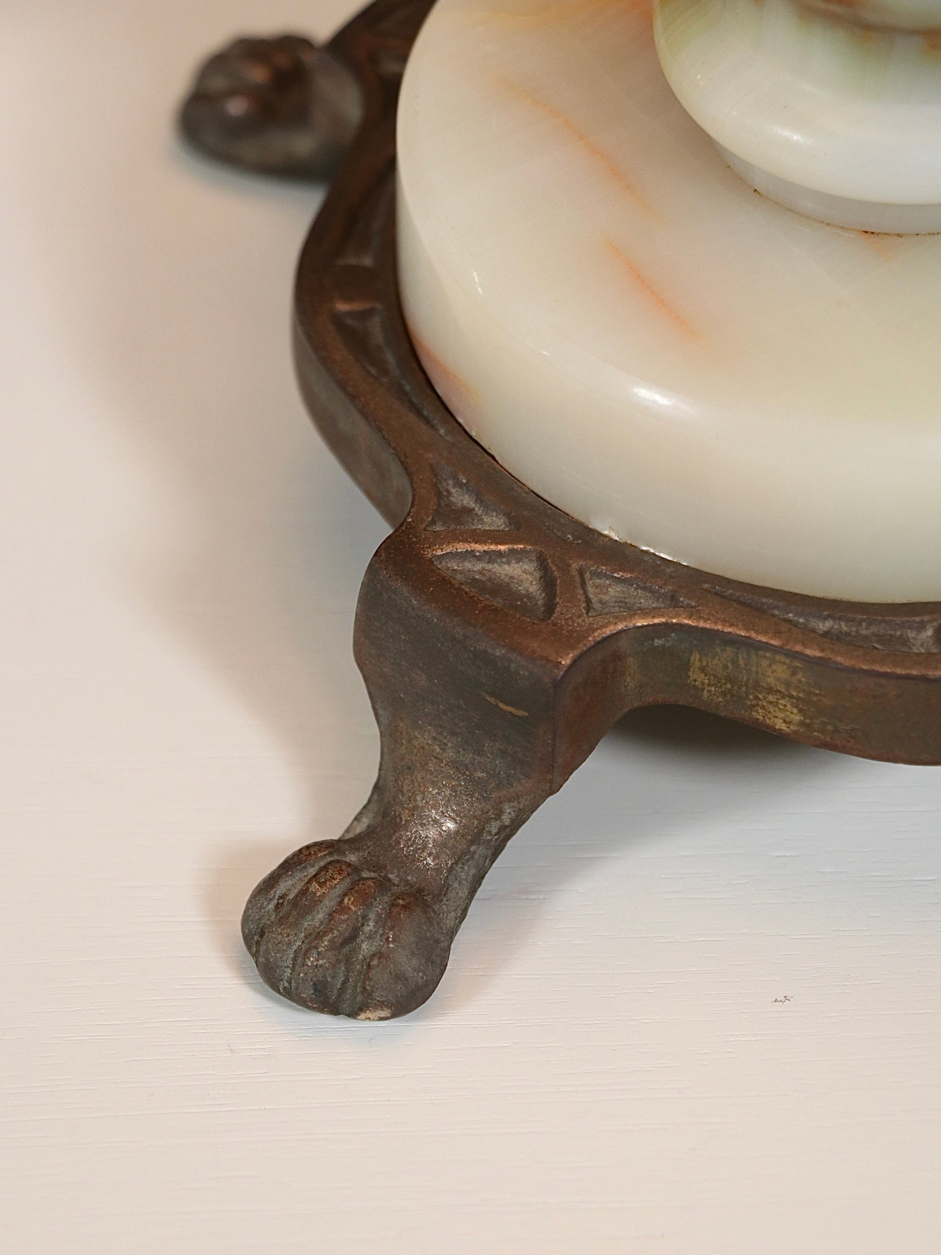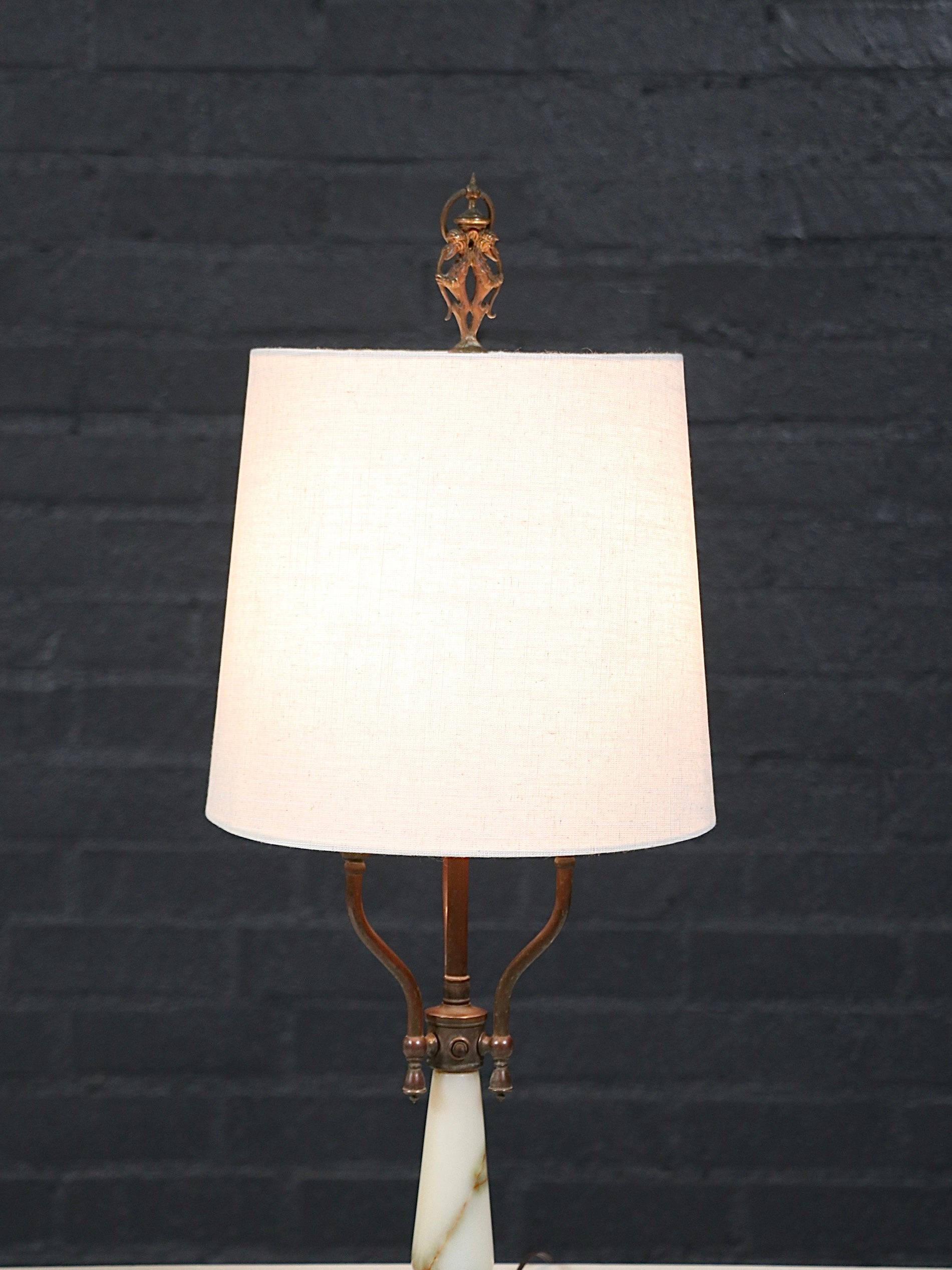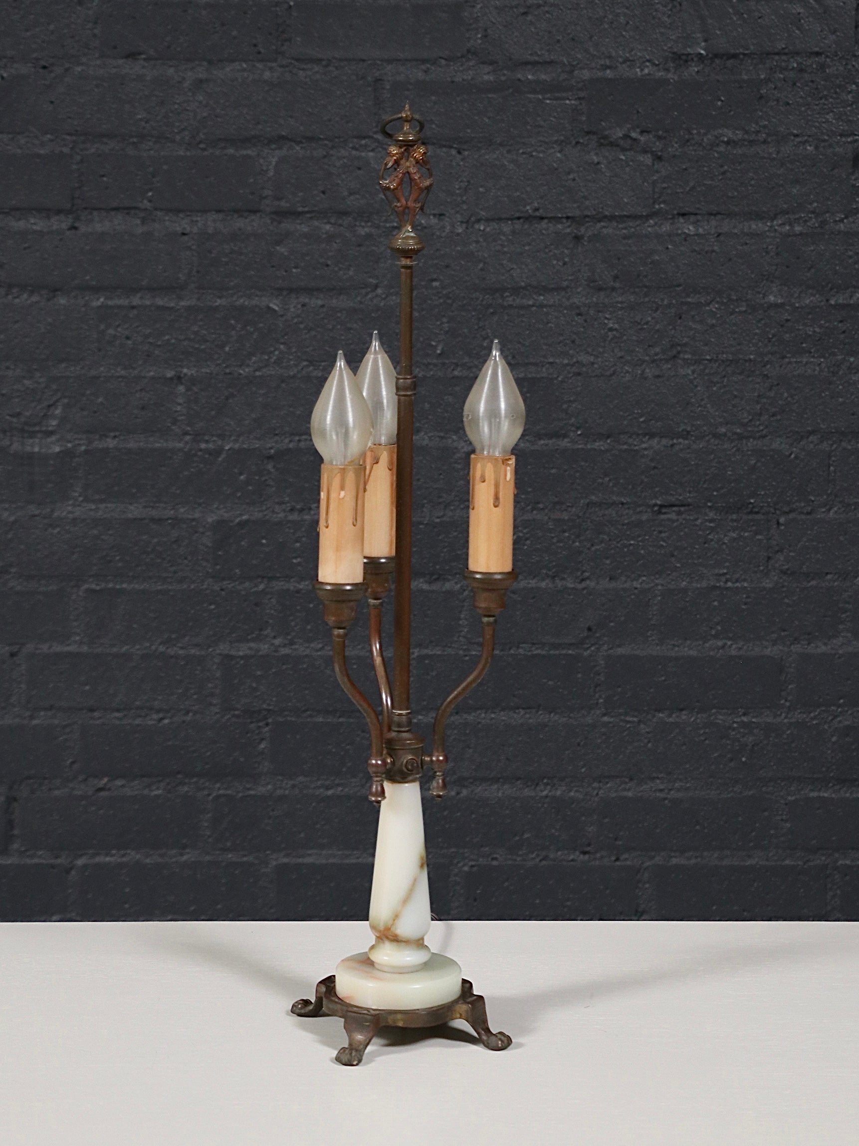 French Neoclassical Style Alabaster & Brass Three-Arm Candelabra Table Lamp, c.1940’s