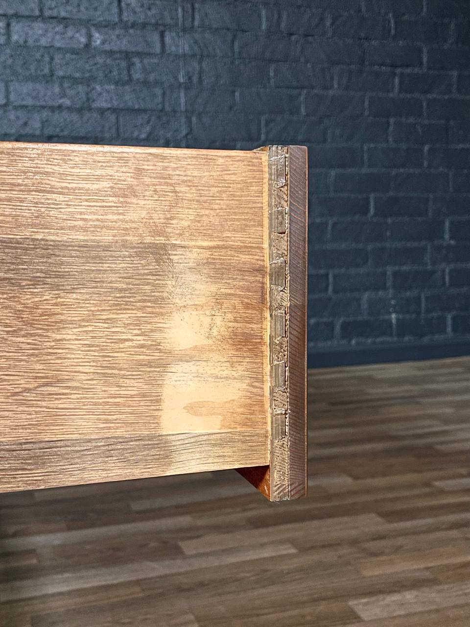 Description: This expertly refinished Mid-Century Modern “Vega” dresser by Morris of California showcases the clean lines and warm walnut grain that defined Californian design in the 1960s. The dresser features six spacious drawers with sculpted pulls, balanced by three central drawers adorned with round walnut knobs accented with brass. Elevated on tapered legs with arched stretchers, the piece combines function and sculptural form, making it both practical and striking. Its craftsmanship highlights Morris of CA’s focus on stylish, accessible furniture that bridged modernist simplicity with everyday living.