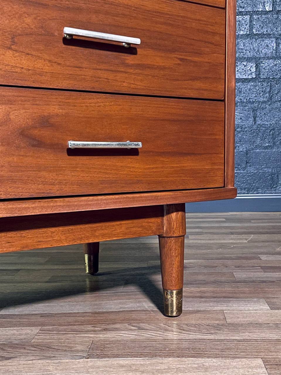 Description: Expertly refinished and thoughtfully restored, this elegant walnut dresser from the Biscayne line encapsulates the crisp, clean lines and elevated functionality of 1950s design. With its rich walnut wood, slim chrome drawer pulls, and patinated brass sabot-caps on the tapered legs, the piece exudes a poised Mid-Century Modern aesthetic. The well-constructed drawers, featuring dovetailed joinery, provide ample storage while maintaining the minimalist silhouette and high-quality craftsmanship typical of Drexel from this era. Elevated on subtly tapered legs, it brings both a lightness and refinement to any contemporary setting, offering a beautifully balanced statement of form and function. Condition is excellent, having been professionally refinished to preserve the integrity of the walnut and metal details, making this dresser ready for a lifetime of enjoyment.