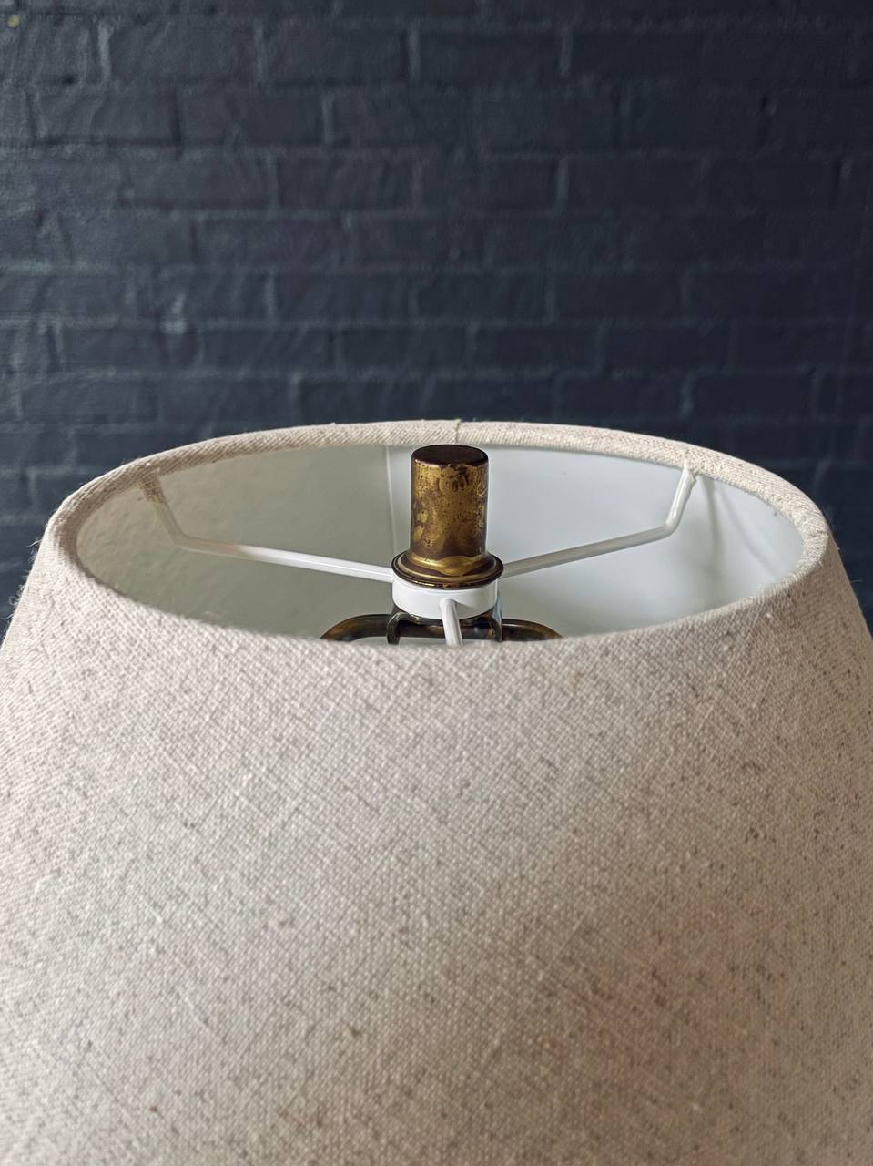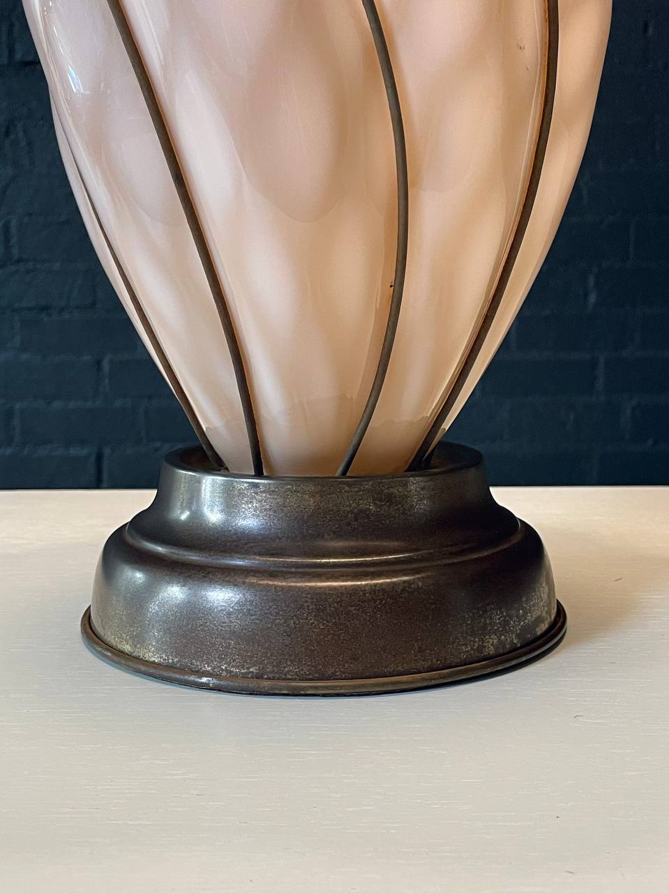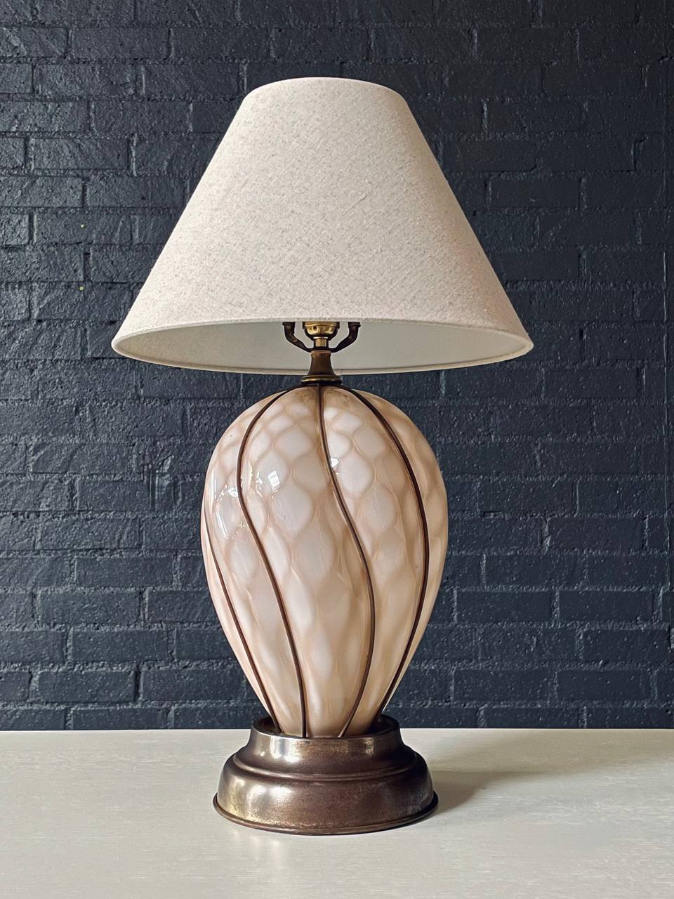 Description: This Mid-Century Modern table lamp by Marbro showcases an exquisite Murano glass body crafted in Italy during the 1960s, paired with a brass base and topped with a new linen shade. The handblown Venetian glass features a soft blush tone with elegant swirling rib details, giving the piece both texture and movement. Its sculptural form is elevated by the warm patina of the brass, blending Italian artistry with Marbro’s American design sensibilities. Newly rewired and complete with a fresh shade, this lamp is ready to bring refined elegance into any interior. A striking balance of craftsmanship and timeless style, it is as functional as it is decorative.