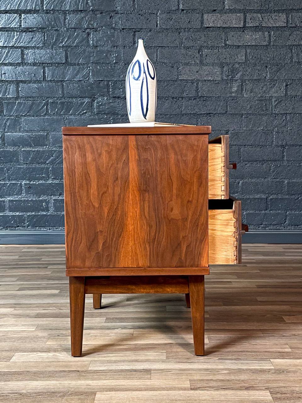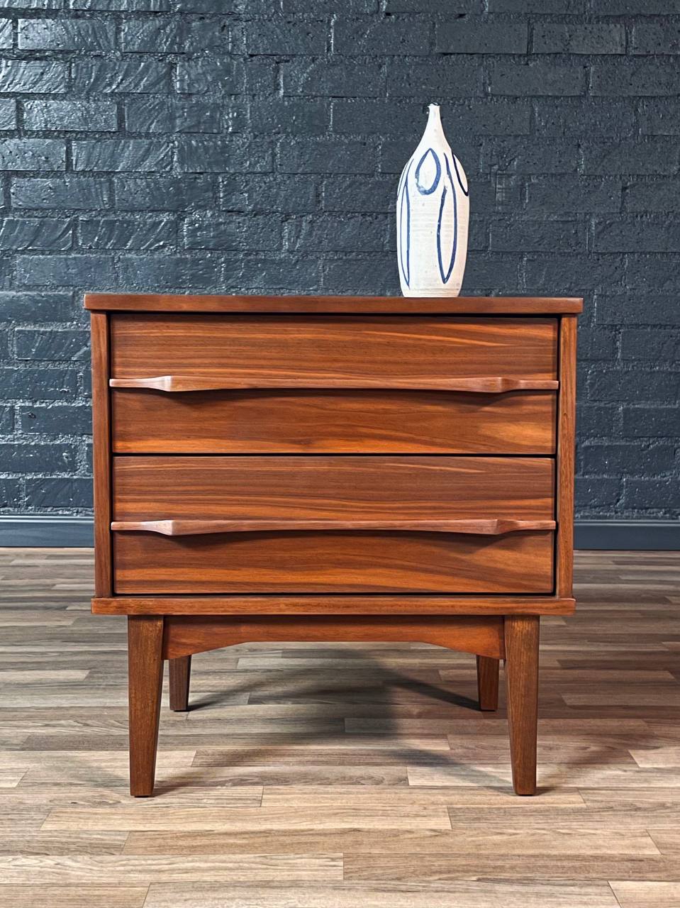 Description: This expertly refinished Mid-Century Modern sculpted walnut nightstand from the 1960s exemplifies timeless craftsmanship and organic design. Its warm walnut grain is beautifully showcased through clean lines and subtly curved drawer fronts that provide both visual depth and tactile appeal. The three drawers offer ample storage, featuring finely dovetailed joints and original brass pulls that highlight its refined construction. Resting on tapered legs with a slightly raised apron, the piece strikes a perfect balance between elegance and utility. Whether used as a bedside companion or an accent table, it embodies the functional artistry that defined the mid-century era.