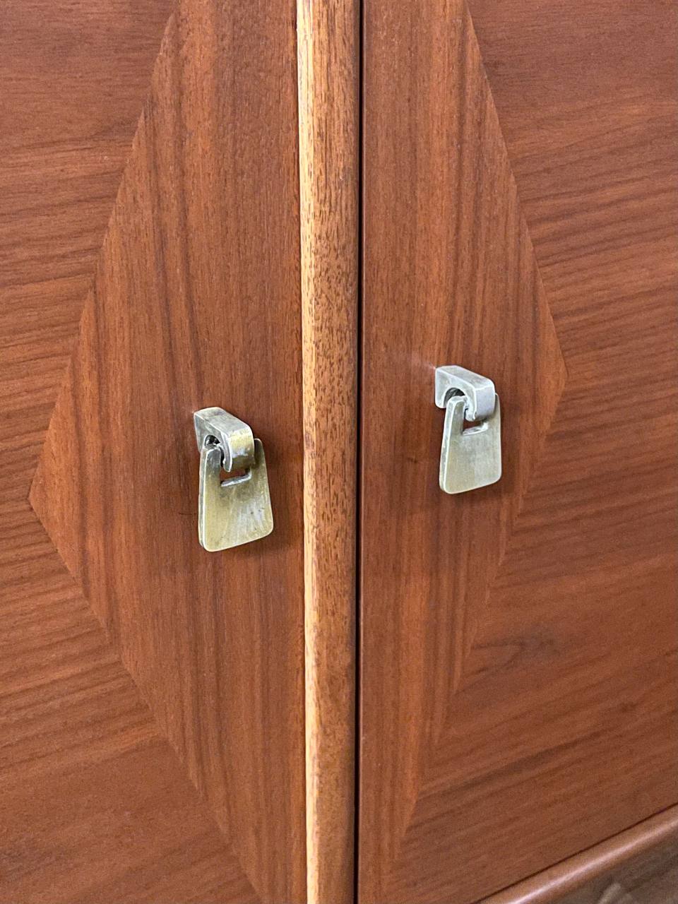 Description: This credenza by Ramseur Furniture Co., crafted in the 1950s, captures the beauty of American Mid-Century design. Its walnut exterior features diamond-patterned doors accented with sculpted brass pulls, creating a sense of rhythm and balance across the front. The piece rests on tapered legs, giving it a light, floating appearance while maintaining a strong architectural presence. Inside, adjustable shelving offers functional storage that complements its refined form. Expertly refinished, it stands as both a practical storage solution and a timeless statement of craftsmanship.