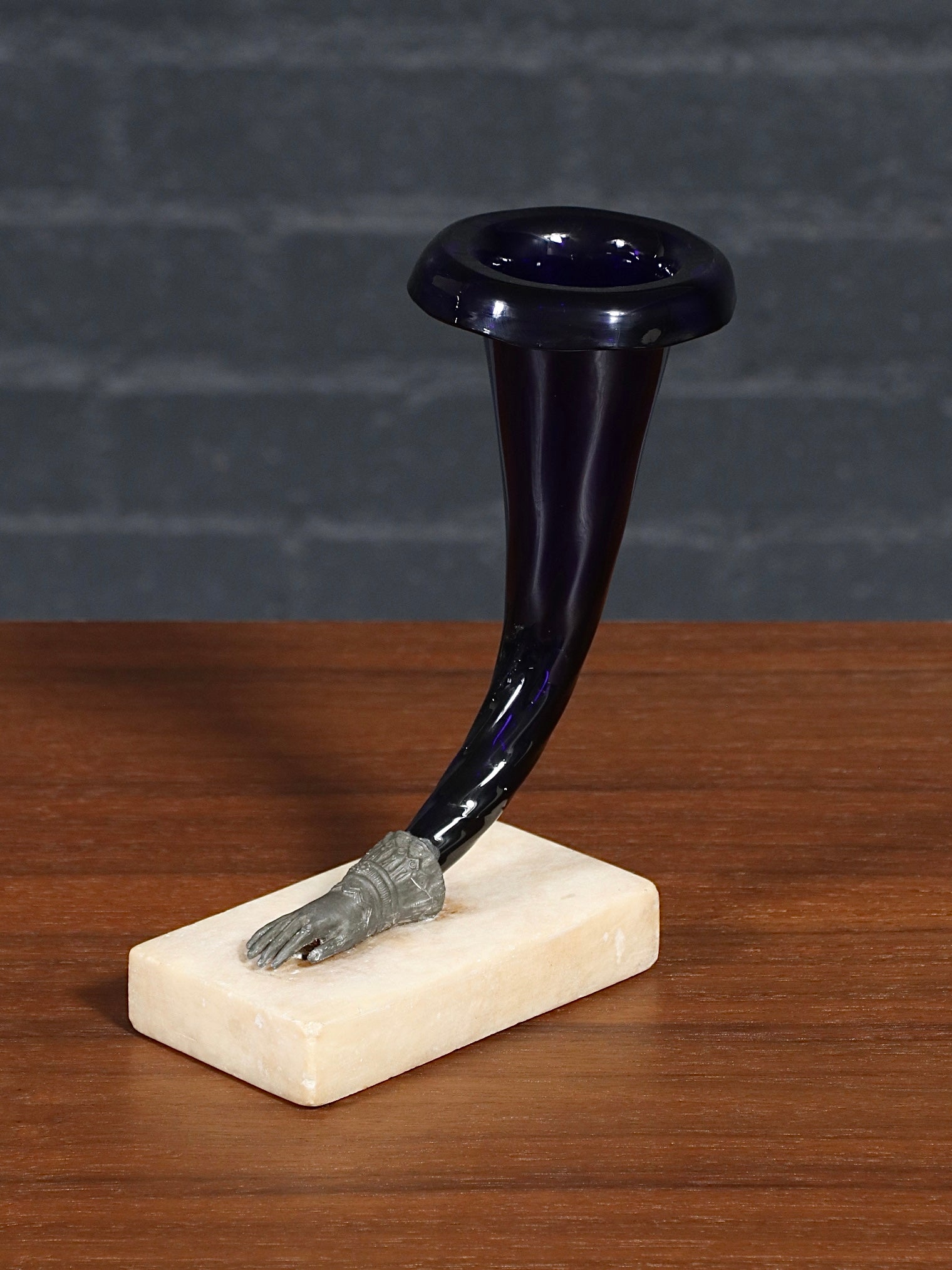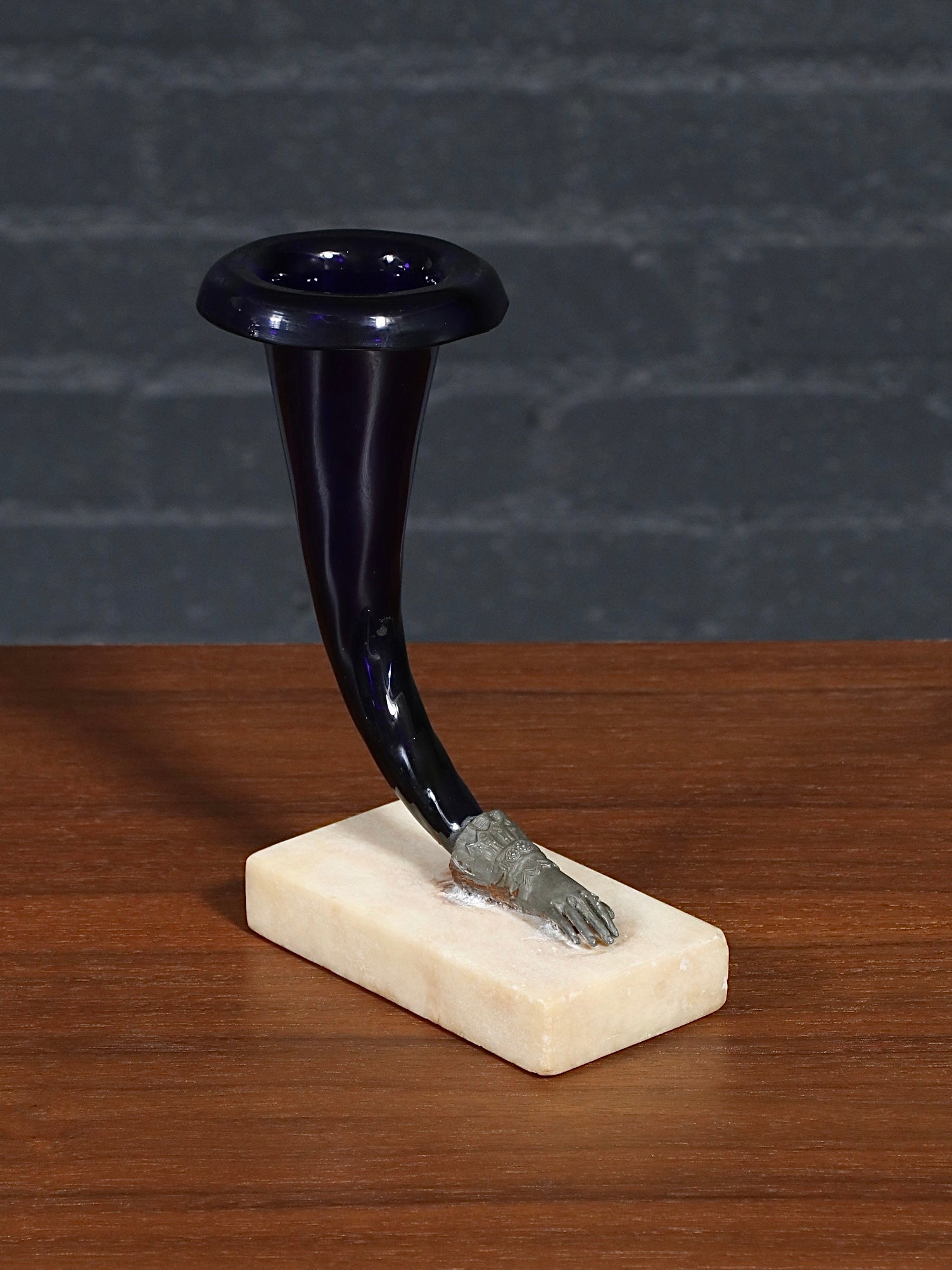 Description: These rare cornucopia vases are an exceptional turn-of-the-century decorative find, pairing rich amethyst glass with a carved marble base and an exquisitely detailed metal “hand” mount that feels truly sculptural. At first glance you’re drawn to the deep purple horn form, but the magic reveals itself up close—the finely modeled fingers, cuff detailing, and aged gilt finish show the kind of careful workmanship you only see in early pieces. The contrast of luminous glass against cool stone and warm metal gives them that unmistakable old-world elegance, equal parts romantic and refined. Likely French and dating to the early 1900s, they were made to read as small objets d’art—functional as bud vases, yet striking even as standalone accents. Offered in original vintage condition, this is the kind of pair that seldom surfaces, especially with such crisp detail and strong presentation.