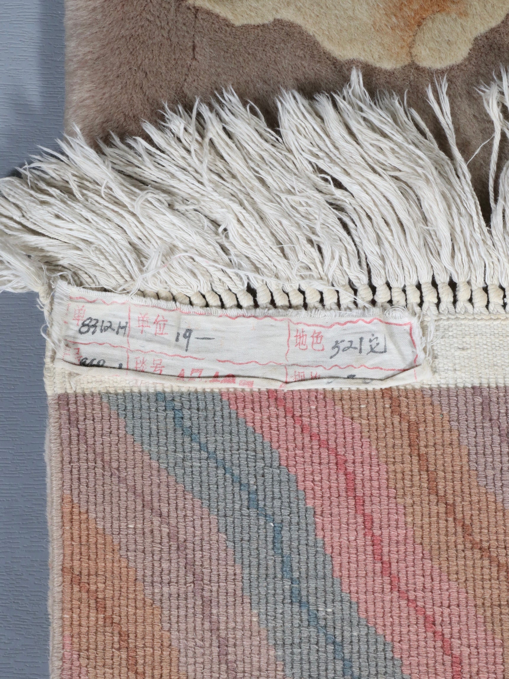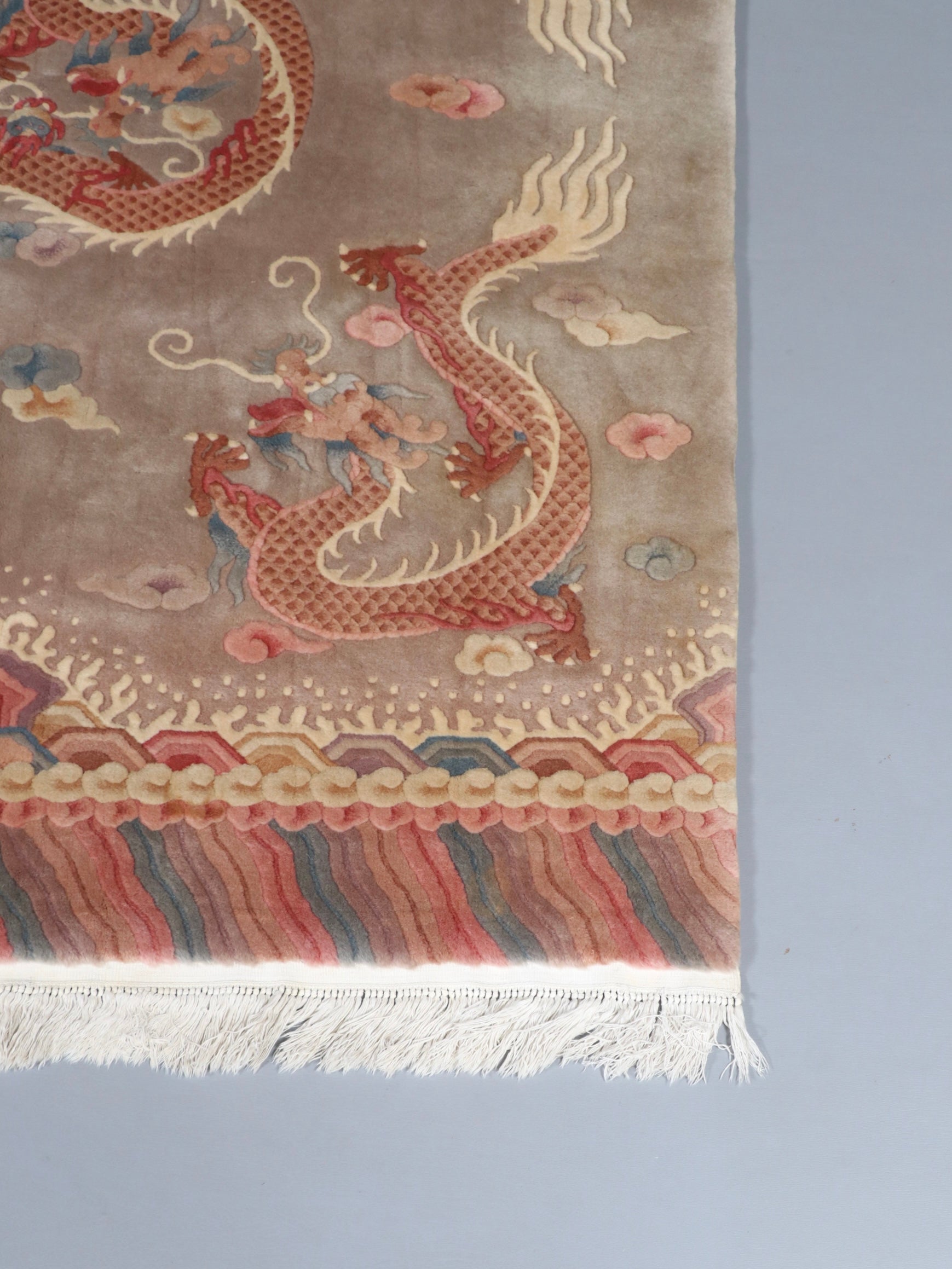 Description: This vintage Chinese Art Deco rug is hand-knotted in wool and features a striking field of stylized dragons floating among soft clouds, framed by a vibrant geometric border. The palette is beautifully balanced—muted and atmospheric in the center, then energized by the rhythmic bands of color at the ends—giving it a look that feels both refined and playful. Its plush pile and tight knotting create a rich, velvety surface that reads as high quality in person and photographs exceptionally well. The proportions make it an ideal statement piece for an entryway, bedside, or layered under a seating area to add warmth and character. Presented in original vintage condition, it’s a rare decorative find that instantly brings artistry and history into the room.
