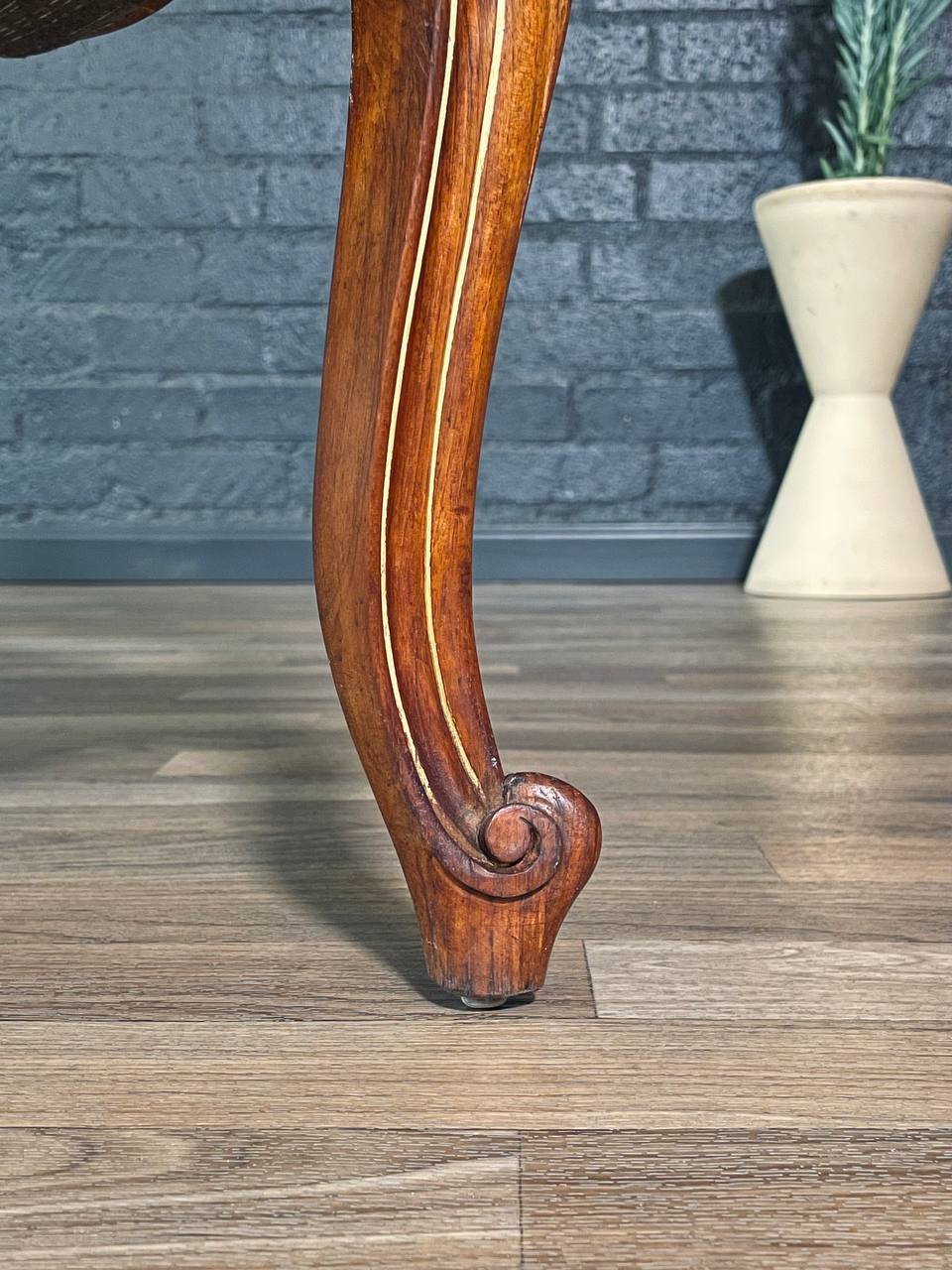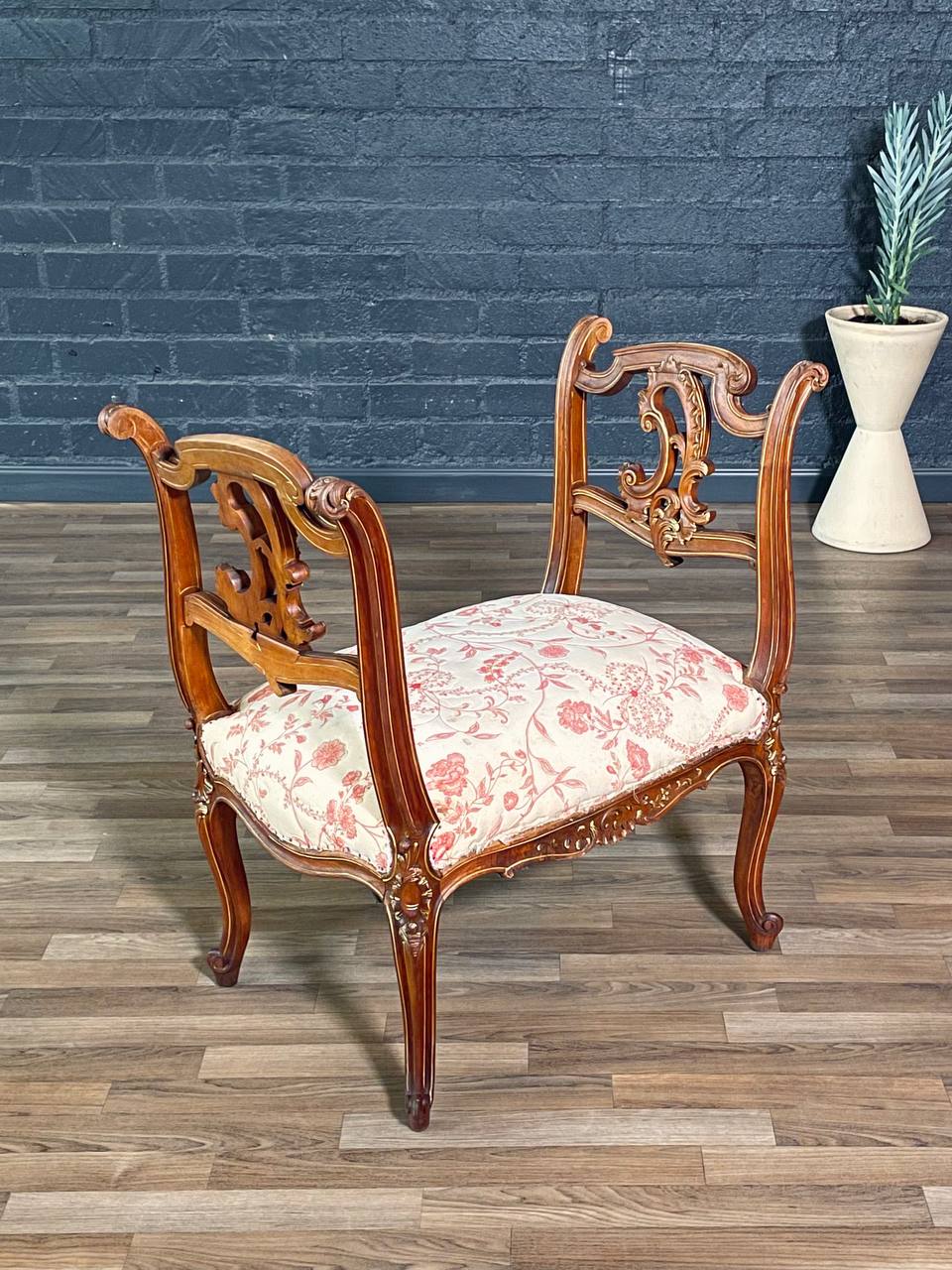 Description: This French Louis XV Rococo style boudoir dressing bench features a beautifully carved walnut frame with scrolling arms, floral motifs, and subtle gilt accents that enrich its elegant silhouette. Designed in the early 1920s, the bench captures the playful curves and ornate character associated with classic Rococo furniture, ideal for a luxurious bedroom, vanity corner, or dressing space. The double-ended open-back form makes it both decorative and functional, originally intended for grooming, shoe fitting, or conversational seating in chic boudoirs. Its floral upholstered cushion remains in original vintage condition and provides an authentic period feel, though new upholstery is recommended for modern use and comfort. With its cabriole legs, detailed carvings, and graceful proportions, this early 20th-century piece stands as a charming example of revived French aristocratic design.