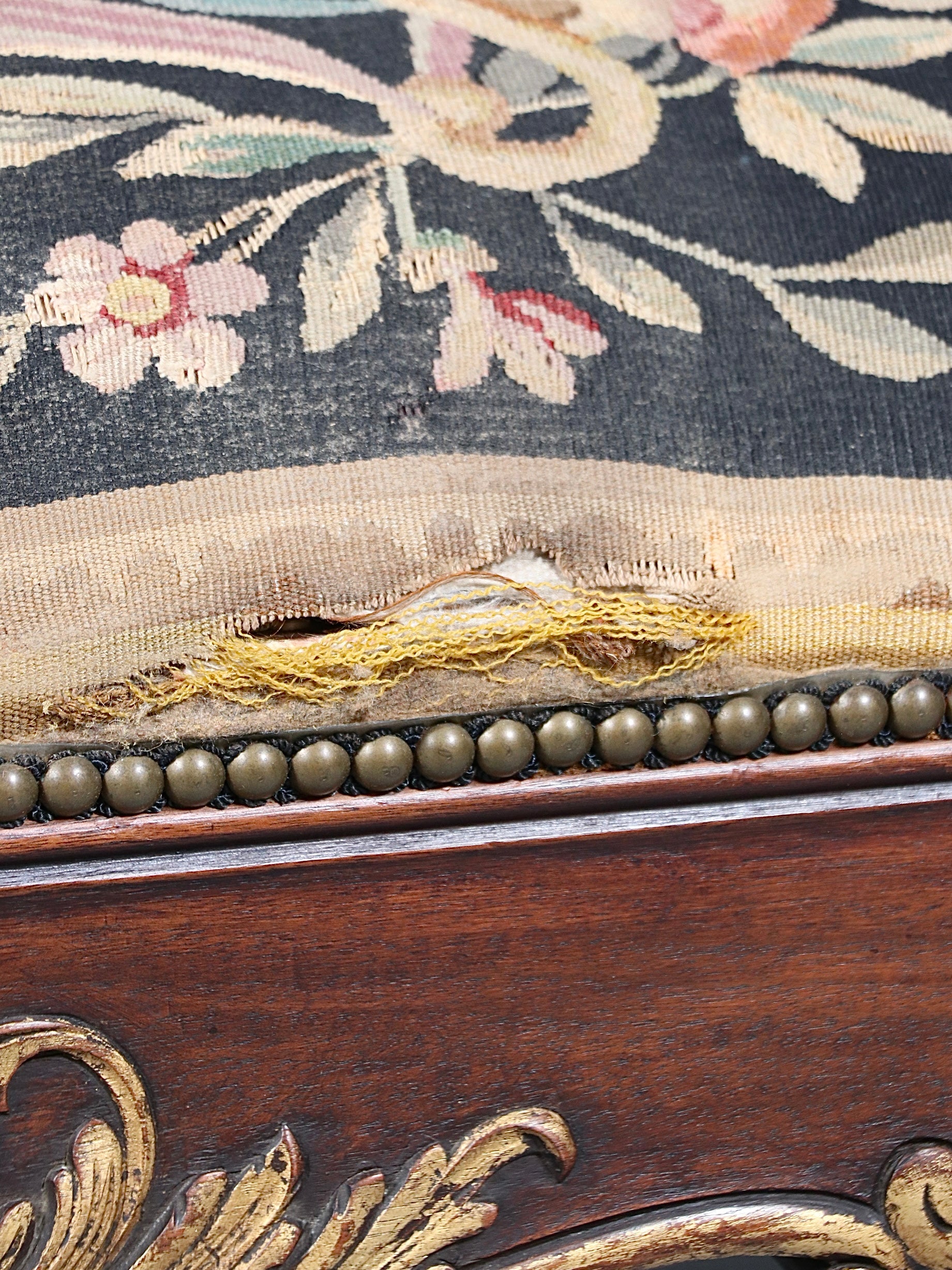 French Louis XV Style Carved Walnut Upholstered Bench w/ Gilt Accents, c.1920’s