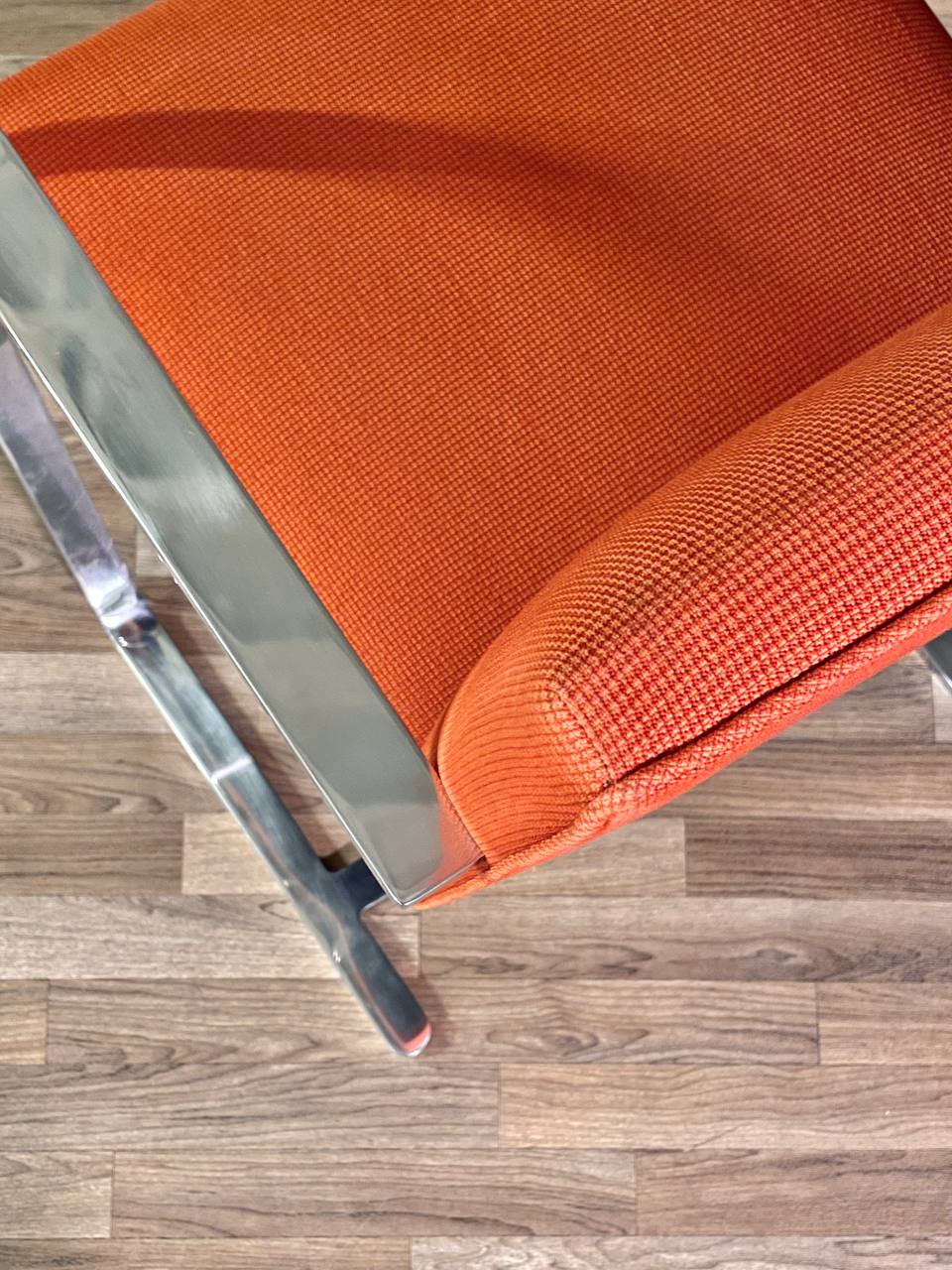 Description: This signed Mies van der Rohe “Brno” chair, produced by Knoll in the 2000s, embodies the timeless elegance of Bauhaus design. Its sleek cantilevered steel frame creates a striking silhouette, complemented by the vivid original orange fabric upholstery. Designed to balance simplicity with comfort, the chair’s flowing lines and minimalist structure highlight van der Rohe’s famous principle of “less is more.” Both sculptural and functional, it remains one of the most iconic designs in modern furniture history. Presented here in original vintage condition, it is a collector’s piece that captures the essence of mid-century modern sophistication.