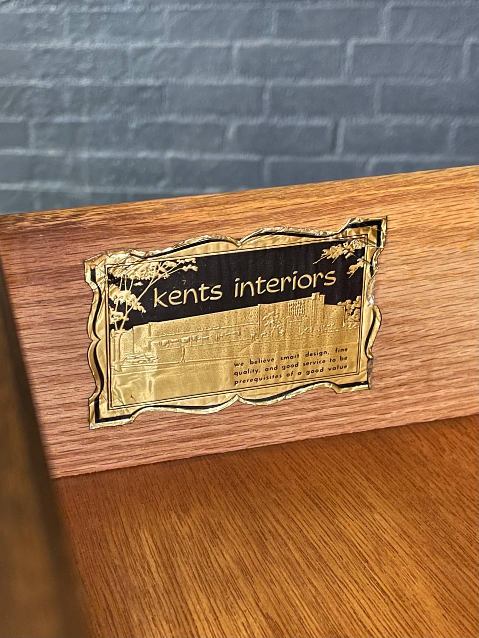 Description: This expertly refinished walnut highboy dresser was produced by Basic Witz in the 1960’s, showcasing the clean, sculpted lines and tapered legs that define Mid-Century Modern design. The rich walnut grain and recessed drawer fronts highlight the brand’s reputation for marrying elegant form with everyday function. While the interior bears a Kents Interiors label, that tag reflects the original retailer that sold the piece, not its maker—a common practice among furniture showrooms of the era. With four deep drawers, it provides both striking presence and practical storage, making it a timeless addition to any interior. Its craftsmanship and proportions reflect the optimism and refinement of postwar American design.