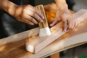 We sand each part manually or with machinery and carefully choose the appropriate stain based on the wood species, applying it in layers to highlight the natural grain.